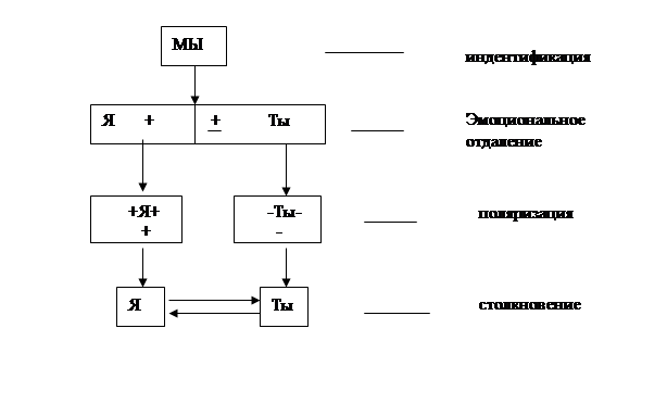 До наступления конфликта представители его сторон индентифицируются в единое МЫ. На первой фазе развития конфликта наступает эмоциональное отдаление между субъектами конфликта. Они начинают видеть в противоположной стороне больше минусов, чем плюсов. Система приобретает форму диполя с противоположно заряженными полюсами.