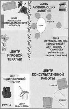 Кабинет психолога находится в стороне от помещений хозяйственного и бытового обслуживания, административного и медицинского блоков, а так же от залов музыкальных и физкультурных занятий. Помещение психологического кабинета, разделено на несколько «рабочих» зон психолога, которые соответствуют основным направлениям его работы в учреждении.