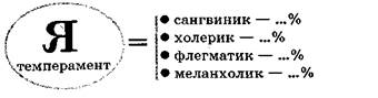 Однако часто у человека может быть выражен не один тип темперамента, а несколько. Для того чтобы определить формулу темперамента, подсчитанное отдельно по каждому разделу количество «+» пересчитывается в проценты: