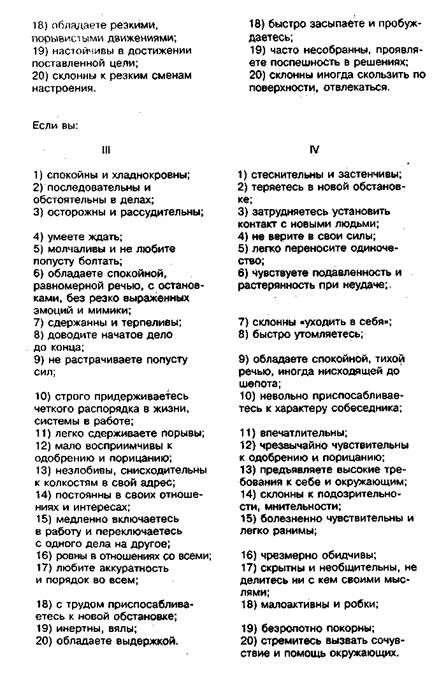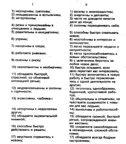 Инструкция. Отметьте, пожалуйста, в каждом из четырех блоков знаком «+» только те качества в паспорте темперамента, которые характерны для вас. Затем по каждому из блоков подсчитайте сумму плюсов и выведите формулу вашего темперамента.