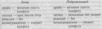 Параметры, вычлененные Миллером и Доллардом для всякой ситуации научения, в случае парнозависимого поведения приложимы, по их мнению, для описания и поведения модели, и поведения наблюдателя. Схематично Миллер и Доллард представляют это следующим образам: