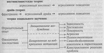 Существует множество теоретических обоснований возникновения агрессии, ее природы и факторов, влияющих на ее проявление. Но все они подпадают под следующие четыре категории. Агрессия относится к: врожденным побуждениям и задаткам; потребностям, активизируемым внешними стимулами; познавательным и эмоциональным процессам; актуальным социальным условиям в сочетании с предшествующим научением.