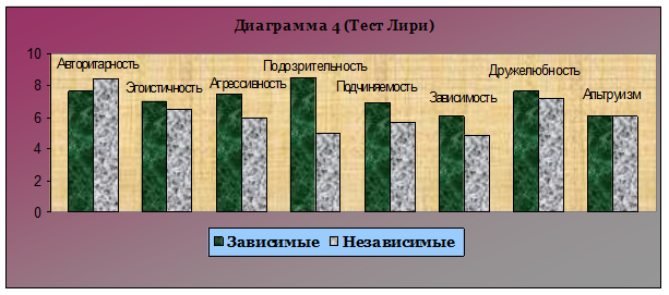 Мы можем с уверенностью утверждать, что существуют специфические особенности в самосознании наркозависимых, представленные в эмоционально-оценочном и эмоционально-ценностном его компонентах. Наркозависимые более негативно относятся к собственному образу-Я. А так же, в своей оценке себя, зависимые личности имеют более негативное и враждебное отношение к обществу и к себе в этом обществе, что показывают результаты теста Лири.