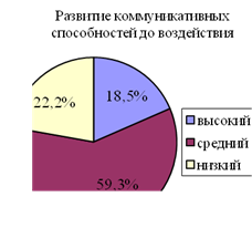 Из данных исследования видно, что теперь учащихся имеющих низкий уровень развития коммуникативный способностей стало 14,8 %, детей с высоким уровнем стало 22,2 %, но все же большинство детей – 63 % имеют средний уровень развития коммуникативных способностей. Больше всего изменения произошли в умение детей овладевать опытом других и более или менее эффективного применения этого опыта в жизни. Есть так же небольшие изменения в способностях к сотрудничеству в учебной деятельности и способности избегать конфликтов.