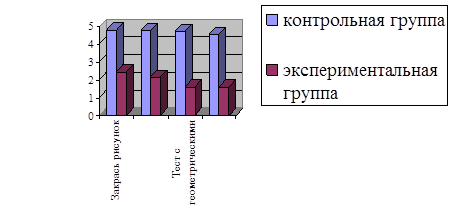 4. Уровень развития пространственного восприятия у детей с ОНР (третий уровень речевого развития) ниже чем у детей без речевых патологий: средний балл при тестировании пространственного восприятия детей экспериментальной группы составляет 1,6 балла, что ниже среднего балла контрольной группы (4,55 балла) на 2,95 балла. Здесь дети экспериментальной группы всех уровней не сразу могли определить подходящий рисунок.