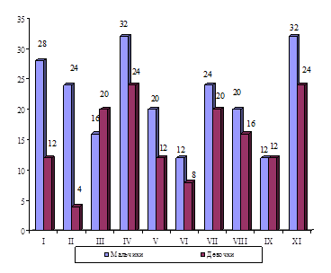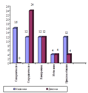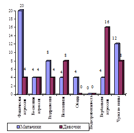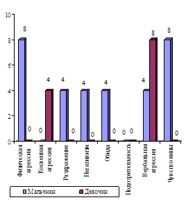 В 11 лет несколько учащались проявления физической агрессии у девочек. Проявления вербальной агрессии с возрастом также учащались, как у мальчиков, так и у девочек. Косвенная агрессия у мальчиков наблюдалась в основном в виде порчи игрушек и предметов. У девочек такое поведение встречалось в два-три раза реже, чем у мальчиков. Реже у мальчиков наблюдались игры с агрессивным содержанием сюжета. В целом у мальчиков отмечена тенденция к преобладанию косвенной агрессии, проявления которой с возрастом становились значительно реже (10, 30-31).