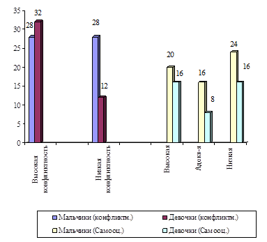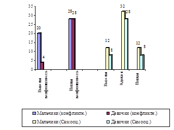 Проанализировав полученные результаты, мы пришли к выводу, что в исследуемой нами группе у 60% подростков адекватная самооценка, что сказалось и на коэффициенте групповой сплоченности. В результате - 24% конфликтных подростков, где 20% мальчиков и 4% девочек, то есть после проведенных коррекционных занятий, конфликтность в группе подростков понизилась.