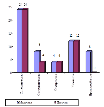 Результаты представленные в таблице показывают, что из стилей поведения в конфликтной ситуации чаще всего испытуемые в группе стали использовать стиль сотрудничество (36%) и компромисс (24%).