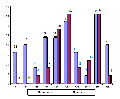 В целом агрессивное поведение более типично для подростков мужского пола, за исключением суицидальных тенденций и смещенной агрессии. Среди девочек систематическая физическая агрессия наблюдается меньше и имеет тенденцию к уменьшению с возрастом. Эпизодическая физическая агрессия, напротив, с возрастом становится чаще в 12— 15 лет и в 16— 17 лет. Примерно такая же динамика физической агрессии (рост эпизодической и снижение систематической физической агрессии) характеризовала процесс взросления мальчиков. При этом систематическая физическая агрессия у мальчиков наблюдалась почти в три раза чаще, а эпизодическая физическая агрессия — в два раза чаще, чем у девочек (16, 15).