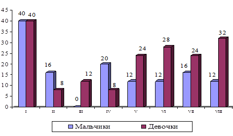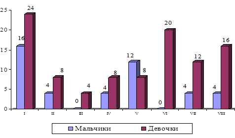 | Всего девочек | в – 3, у – 5, н – 5 | в – 4, у – 7, н – 2 | |