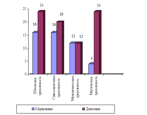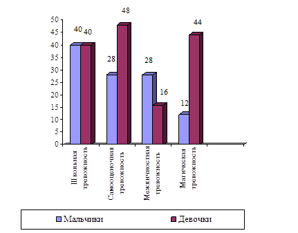 Проанализировав полученные результаты, мы пришли к выводу, что в исследуемой нами группе у девочек школьная и магическая тревожность выше (48%), чем у мальчиков (20%). Межличностная тревожность в исследуемой группе одинакова как у мальчиков, так и у девочек (по 12%). Исследование показало, что тревожность выше у девочек, чем у мальчиков, но на формирующем этапе эксперимента количество тревожных подростков стало меньше.