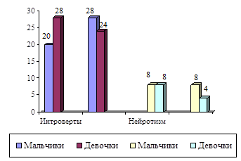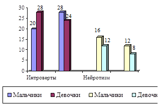 На формирующем этапе эксперимента на основании полученных данных можно сделать вывод о том, что экстравертированному типу относится большинство мальчиков, а к интровертированному типу личности относится большинство девочек. Природа интро- и экстраверсии усматривается во врожденных свойствах центральной нервной системы, которые обеспечивают уравновешенность процессов возбуждения и торможения. Из результатов исследования также видно, что среди мальчиков преобладает нейротичный и психотичный тип личности.