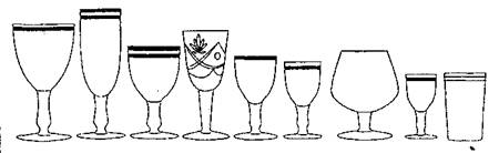Рис. 2. Стеклянная и хрустальная посуда (слева направо): фужер, бокал для шампанского, рюмка для красного вина (лафитная), рюмка для белого вина (рейнвейная), рюмка дли крепкого вина (мадерная), рюмка для водки и водочных изделий, коньячная рюмка в виде усеченного конуса, рюмка для ликера, коническая стопка для сока.