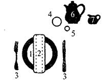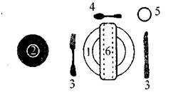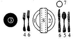 1 - столовая тарелка; 2 - закусочная тарелка; 3 - пирожковая тарелка; 4 - закусочные приборы; 5 - столовая ложка; 6 - столовые приборы; 7 - фужер; 8 -салфетка.