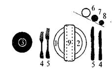 1 – столовая тарелка; 2 – закусочная тарелка; 3 – пирожковая тарелка; 4 закусочные приборы (нож, вилка); 5 – столовые приборы (нож, вилка); 6 - фужер; 7 - рюмка для вина; 8 - рюмка для водки; 9 - салфетка.