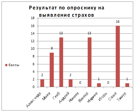 3. Перечень использованных методик и условия проведения обследования: метод наблюдения и беседы, а так же следующие методики: Опросник на выявление страхов, методика «Размещение себя на шкале», методика «Кактус».