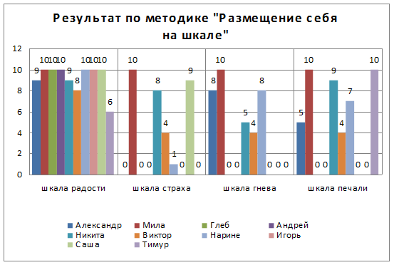 5. Описание результатов обследования: по опроснику на выявление страхов у Милы выявлены страхи кошмарных снов и темноты. Она до сих пор боится сказочных персонажей. Это связано со своеобразным развитием эмоциональной сферы умственно отсталого ребёнка, которая проявляется, прежде всего, в незрелости. По методике «Размещение себя на шкале» - по всем шкалам было выявлено высокое эмоциональное состояние. Будь то радость, страх, гнев и печаль.