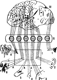 Рис. 1. Строение анализаторов 1-7 - рецепторы: зрительный, слуховой, кожный, обонятельный, вкусовой, двигательного аппарата, внутренних органов; А - центростремительные (афферентные) нервные пути; I – область спинного и продолговатого мозга; II - область промежуточного мозга (так называемые зрительные бугры - таламус), где нервные импульсы переходят на нейрон, идущий к коре мозга; III - кора мозга.