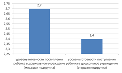 В результате проведенного исследования было выявлено, что уровень готовности к поступлению в детский сад у детей различен. Более высокий уровень готовности у детей старшей подгруппы, они готовы к поступлению в детский сад. У младшей группы условная готовность к детскому саду. Возможно, это объясняется возрастными особенностями детей младшей подгруппы, их потребностью быть все время с матерью. Уровень психофизиологической адаптации к условиям дошкольного учреждения более высок у детей старшей подгруппы.