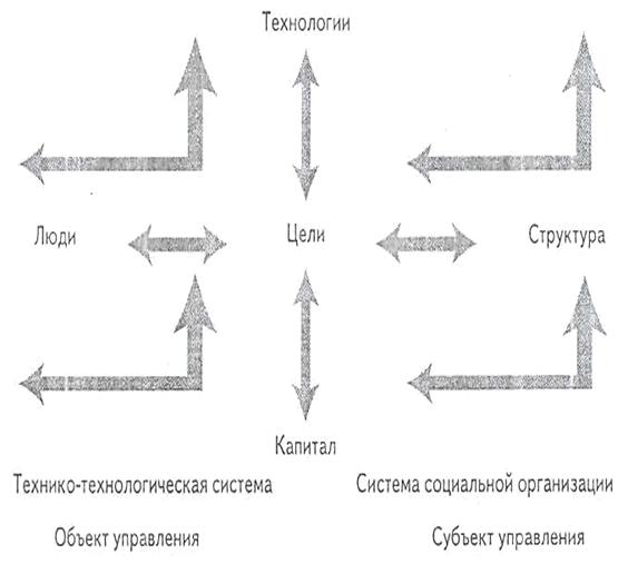 Интересы комплексного решения проблем организаций требуют учета того, что в состав их элементов входят объекты двоякой природы. С одной стороны, это факторы, определяющие социально-экономическую структуру организации (индивидуумы с их способностями, интересами и подготовленностью, социальные совокупности, подразделения, распределение полномочий и ответственности, неформальные отношения, потоки информации). С другой стороны, это элементы, определяющие производственно-техническую структуру организации (орудия труда, материальные ресурсы, технологические правила).