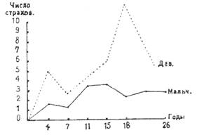На диаграмме выступают с полной ясностью особенности в развитии страха в зависимости от возраста и пола.