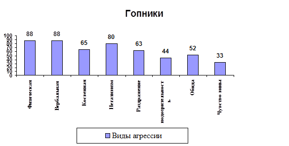 Из графика видно, что у гопников преобладает физическая агрессия, вербальная агрессия и негативизм. Это говорит о том, что уровень агрессии у гопников высокий, они используют физическую силу против другого лица, выражают негативные чувства через речь, переходят от пассивного сопротивления до активной борьбы против установившихся законов и обычаев. Чувство вины для таких людей практически не присуще.