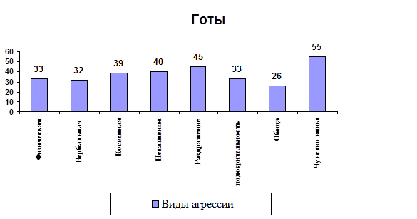 Из графика видно, что готы не обладают большой агрессией, все показатели почти на одном уровне. Это можно объяснить тем, что они живут в своем мире и им не важно, что происходит вокруг них, и, следовательно, им не на кого проявлять агрессию. Однако у готов очень высокое чувство вины, это можно объяснить тем, что их субкультура подразумевает это, т.к. они постоянно находятся в состоянии депрессии, ходят на кладбища, иногда, так же как и сатанисты, они приносят жертвы (животных) и возможно, что им жаль, что они совершили такой поступок.