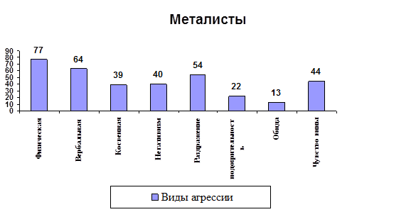 На этом графике отчетливо видно, что по уровню агрессивности на первом место стоят гопники. Это связано стем, что гопники используют физическую силу против другого лица, выражают негативные чувства через речь, переходят от пассивного сопротивления до активной борьбы против установившихся законов и обычаев. Чувство вины для таких людей практически не присуще. Они постоянно вступают в конфликты из-за любой мелочи.