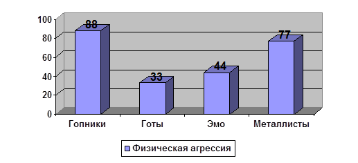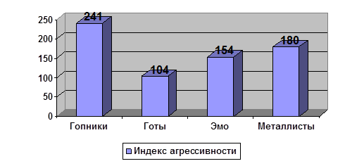 Подводя итог, можно сказать, что у любой из субкультур уровень агрессии находится на разном уровне. Однако первое место по агрессивности занимают гопники.