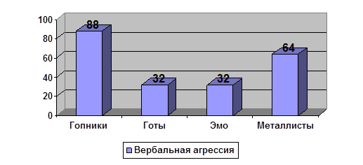 На этом графике мы можем видеть, что по критерию физической агрессии более агрессивными являются гопники. На втором месте находятся металлисты. Это можно объяснить тем, что гопники и металлисты являются «врагами», они находятся в постоянной вражде друг с другом, поэтому и у той и у другой субкультуры уровень физической агрессии находится на высоком уровне.