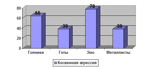 На этом графике мы видим, что по уровню косвенной агрессии на первом месте стоят эмо. Скорей всего это связано с тем, что эмо намного трусливее, нежели другие субкультуры, и боятся вступить в конфликт с другими людьми, поэтому им нет смысла проявлять физическую или вербальную агрессию на кого-либо открыто. У гопников же (стоят на втором месте) агрессия проявляется во всех видах, поэтому они и стоят на втором месте.