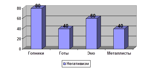На этом графике на первом месте стоят эмо. Это можно объяснить тем, что эмо по любому поводу готовы проявить негативные чувства, вследствие своей эмоциональности.
