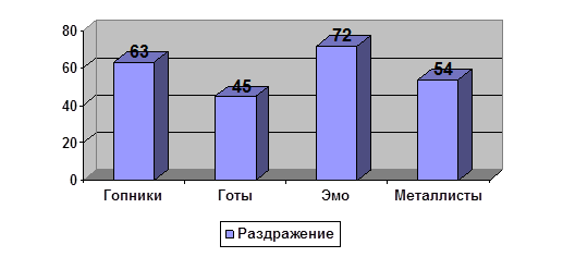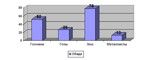 На этом графике эмо опять находятся на первом месте. Скорей всего, это можно объяснить тем, что в большинстве случаев эмо, как субкультуру, не любят. Из-за этого у них проявляется обида ко всем окружающим.