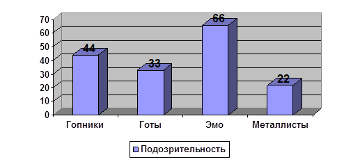 На этом графике эмо опять находятся на первом месте, и скорей всего это связано с тем, что эмо, как субкультуру не любят, и поэтому они относятся ко всем с подозрением и ожидают от любого человека подвоха.