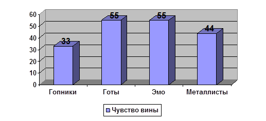 На этом графике готы и эмо находятся на первом месте. Это можно объяснить тем, что у готов проявляется чувство вины из-за того, что их субкультура подразумевает это, т.к. они постоянно находятся в состоянии депрессии, ходят на кладбища, иногда, так же как и сатанисты, они приносят жертвы (животных) и возможно, что им жаль, что они совершили такой поступок. У эмо это может быть связано с тем, что они очень эмоциональны, и очень близко все принимают к сердцу.