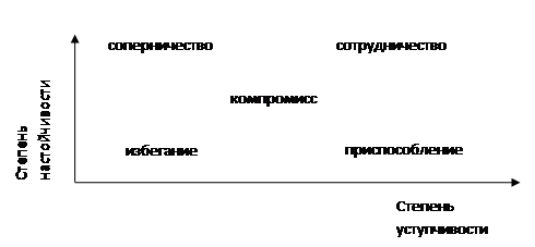 Широкое распространение в конфликтологии получила разработан-ная К. Томасом и Р. Киллменом двухмерная модель стратегий пове¬дения личности в конфликтном взаимодействии. Стратегия поведения в конфликте рассматривается как ориентация личности (группы) по отношению к конфликту, установка на определенные формы поведения в ситуации конфликта. В основе этой моде¬ли лежат ориентации участников конфликта на свои интересы и ин¬тересы противоположной стороны (10, с. 54). Согласно модели, конфликтное поведение выстраивается в пространстве, заданном системой координат, где: по вертикальной оси указывается степень настойчивости в удовлетворении собственных интересов, представляемая как важность результатов; по горизонтальной оси – степень уступчивости в удовлетворении интересов других партнеров, представляемая, как важность отношений.