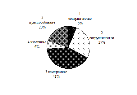 В результате исследования с применением теста К. Томаса «Стиль конфликтного поведения» было доказано, что большинство испытуемых не являются конфликтными личностями и большинство испытуемых предпочитают стратегию компромисса (42 %). Зная эти данные, можно избежать излишних конфликтов. Учитывая стиль поведения человека и зная свой, можно избежать возникновения конфликтных ситуаций и разрастания конфликта. В результате проведенного нами исследования мы пришли к выводу о том, что каждая стратегия эффективна только в определенных условиях. Каждый участник конфликтной ситуации должен уметь эффективно использовать все стратегии, делать тот или иной выбор, учитывая конкретные обстоятельства. Наилучший подход определяется конкретной ситуацией, а также складом характера оппонентов. Предпочитать одни стратегии другим – естественно, но жесткое предпочтение ограничивает возможности конфликтующих сторон. Важно определиться с приоритетами и возможными альтернативными вариантами, это позволит оппонентам быть более свободными в выборе при столкновении с конкретными конфликтными ситуациями.