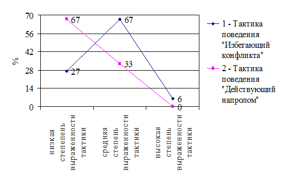Количество баллов дает представление о выраженности тенденции к конфликтности. Обработка полученных данных представлена нами в табл. 2, которая показывает соотношение количества человек со степенью выраженности конкретной тактики в процентном отношении.