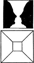 Двойственным является и изображение усеченной пирамиды. Она кажется то выпуклой, обращенной вершиной к зрителю, то углубленной с уходящей вдаль задней стенкой. И опять-таки здесь налицо колебания внимания: стенка как бы то приближается, то удаляется от зрителя. Впрочем, колебания можно снять, если не просто рассматривать фигуру, а поставить перед собой новую, более сложную задачу. Представим себе, что перед нами изображение комнаты, которую необходимо обставить: справа поставим стол и стулья, слева на стену хорошо бы повесить картину, на пол постелить ковер, на потолок - хорошо бы люстру и т. д. Пока вы «обставляете» комнату, колебаний внимания не будет... Из этого опыта можно сделать выводы, касающиеся сохранения устойчивости внимания: необходима внешняя и внутренняя активность личности, надо ставить перед собой все новые и новые, задачи.