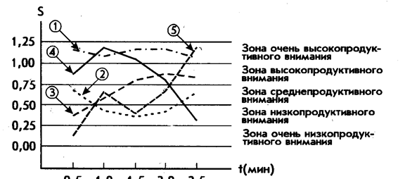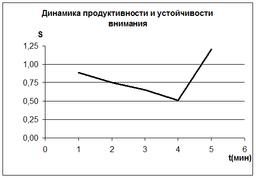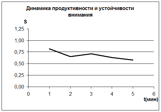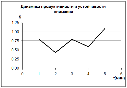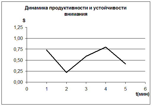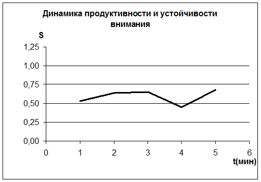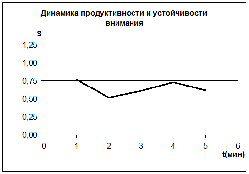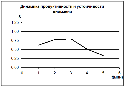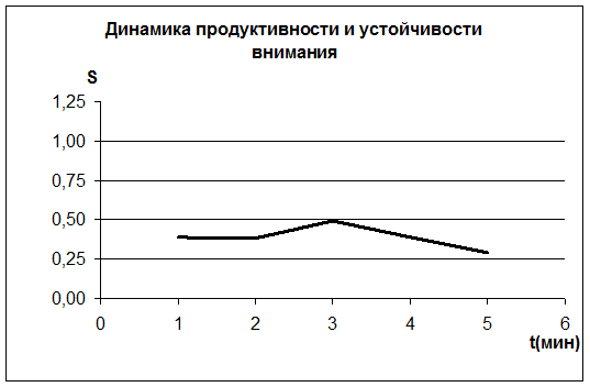 Вывод: Показатель S =0,74 , таким образом, продуктивность внимания средняя – оценивается на 4-5 баллов. На графике видны большие колебания внимания, сам график находится в четырех разных зонах, следовательно внимание неустойчиво и оценивается 4-5 балла.