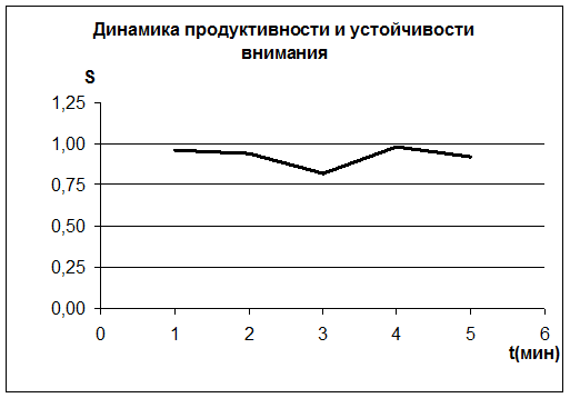 Вывод: График находится в пределах от 0,75 до 1,00 балла, что говорит о высокой продуктивности внимания; Все точки графика не выходят за пределы одной зоны, таким образом, внимание высоко устойчивое. Продуктивность испытуемого оценивается на 6-7 баллов, а устойчивость внимания на 10 баллов.