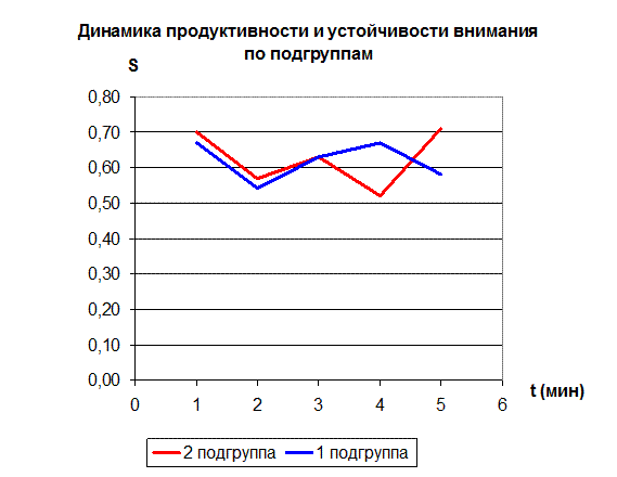 Таким образом, мы видим, что действительно существуют индивидуальные различия во внимании. При там, что все участники эксперимента примерно одного возраста? Состояние здоровья хорошее, условия проведения эксперимента одни и те же. Если сравнивать 2 подгруппы и построить график на подгруппу в целом путем сложения всех показателей S1 , S2 , S3 , S4 , S5 подгруппы и разделить числа на 5( по количеству участников) получим: