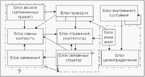 Любая цель и действие выполняются в своем контексте(системе данных и знаний). Деятельность любого процесса заметно только если она изменяет элементы контекста. Контексты разных целей (процессов) могут пересекаться или включаться один в другой, что определяется связанностью (однотипностью) этих целей. Если происходит операция уточнения цели, то уточняется и контекст (становится меньше). Контекст может состоять из одних элементов (структур данных, знаний) или из разных. В первом случае решается вопрос о связях (количестве) базовых элементов, во втором случае о правилах приведения одного элемента контекста в другой. (Четкое разграничении структуры от собственно данных, позволяет описывать ситуацию, когда механизм выведенный на структуре одного контекста применяется к совершенно другому контексту).