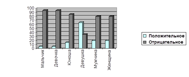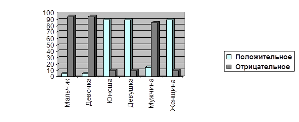 Для девочек же характерно неприятие лиц противоположного пола только мужчин (85 %). А к женщинам и сверстникам обоих полов в отличии от мальчиков наблюдается положительное эмоциональное отношение (90 %).