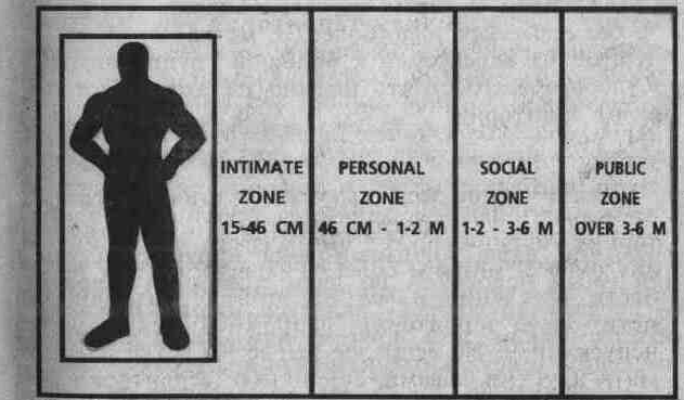 Итак, каждый человек имеет свою территорию. Под территорией понимается также пространство, которое человек считает своим, как будто это пространство является продолжением его физического тела. каждый человек имеет свою собственную личную территорию, которая включает пространство, окружающее его собственность, например, его дом, окруженный забором, машину во дворе, его спальню, стул, и, как обнаружил доктор Холл, он имеет также четко обозначенное воздушное пространство вокруг своего тела.