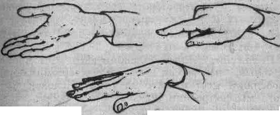 Существует три основных командных жеста ладони: положение ладони вверх, положение ладони вниз и положение указывающего перста.