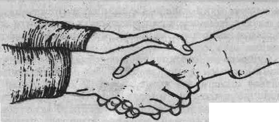 При покорном рукопожатии Ваша рука будет повернута ладонью вверх (рис.9). Однако необходимо иметь в виду, что возможны обстоятельства, при которых положение ладони вверх не обязательно будет трактоваться как проявление покорности. Например, человек страдает артритом рук и поэтому вынужден обмениваться слабым рукопожатием.