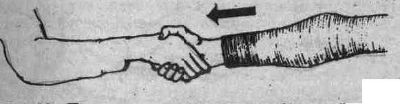 Пожатие несогнутой, прямой рукой (рис.15), как и доминантное, является признаком агрессивного человека. Это рукопожатие так же используется с целью защиты своей личной территории.