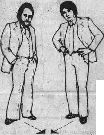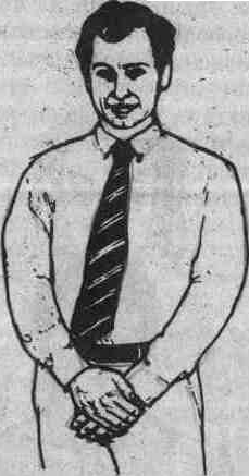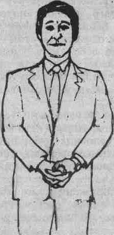 Исследования, проведенные Ниренбергом и Калеро по изучению жеста сцепленных пальцев рук, позволили им заключить, что этот жест обозначает желание человека скрыть свое отрицательное отношение. Этот жест имеет три варианта: скрещенные пальцы рук лежат на столе, на коленях в сидячем положении (рис.17),подняты на уровне лица (рис.18) или находятся внизу перед собой в стоячем положении (рис.19).