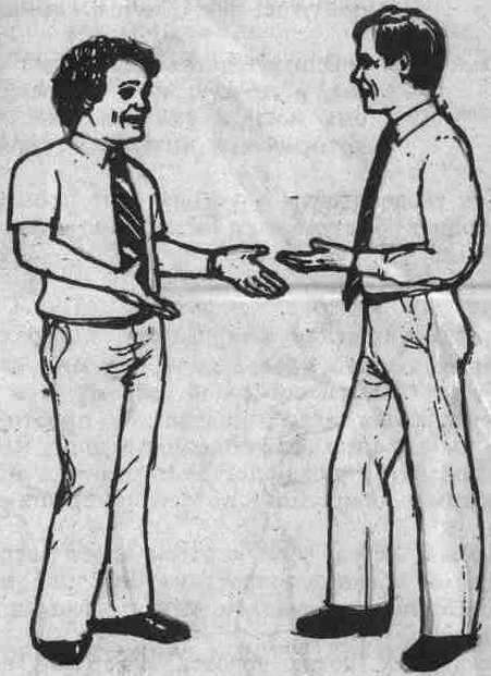 Когда человек здоровается с Вами властным рукопожатием, трудно не только склонить его к уступчивому типу рукопожатия, но и сделать это незаметным образом. Существует простой способ «разоружения» властного партнера, который дает Вам возможность не только вернуть себе инициативу, но и озадачить другого вторжением в его личную зону. Чтобы научиться этому способу обезоруживания, необходимо оттренировать следующие движения: когда Вы берете руку, сделайте шаг вперед левой ногой. Затем переставьте правую ногу вперед и встаньте слева перед этим человеком, продвигаясь в его личную зону. Затем, для завершения маневра, левую ногу поставьте за правой и встряхните руку партнера. Эта тактика позволит Вам выровнять положение рук или развернуть руку другого человека к уступчивому типу рукопожатия.